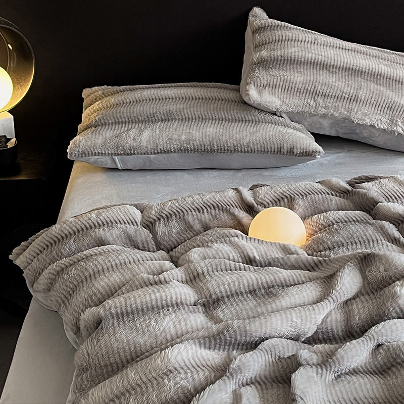 Lujo Faux Rabbit Fur Stripe Fleece 4PCS Juego de ropa de cama Juego de funda de edredón cálido Funda de edredón Juego de sábanas planas para invierno