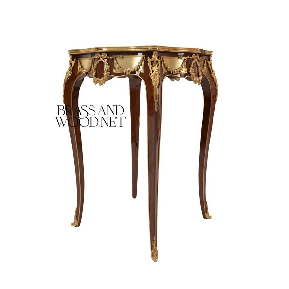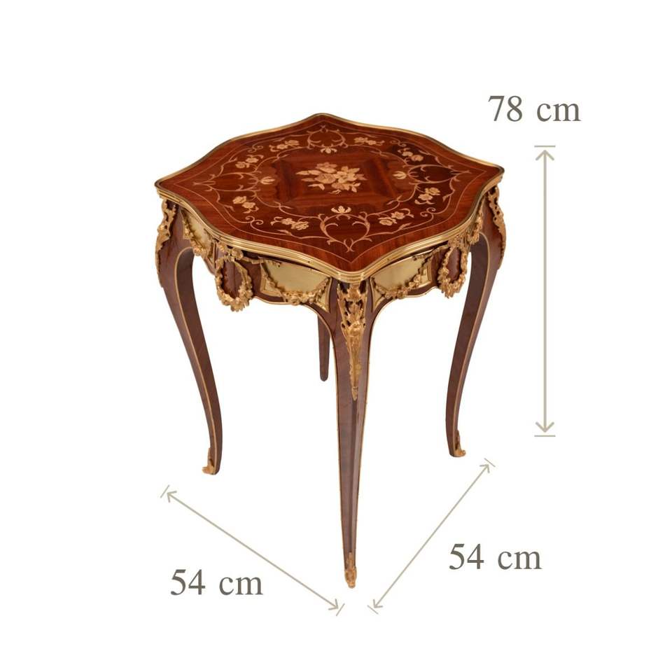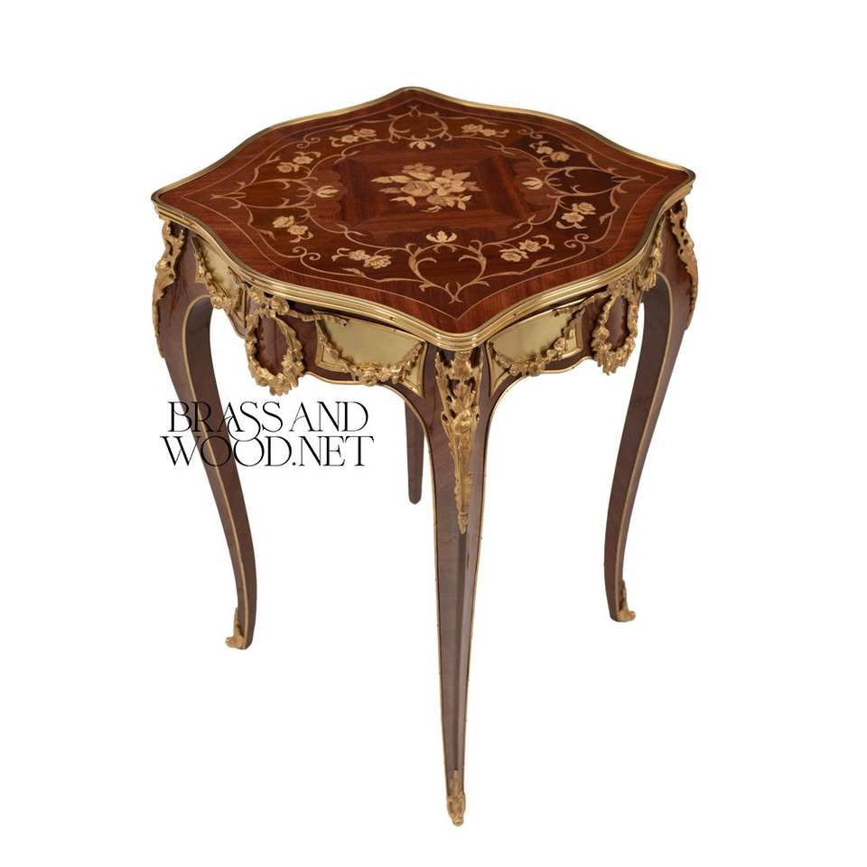 Mesa Auxiliar Cuadrada de Estilo Francés de Lujo con Incrustaciones Florales Refinadas y Detalles Ornamentales de Latón Dorado para Decoración de Palacios