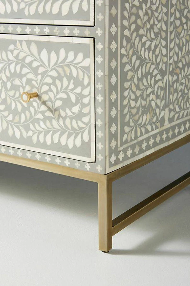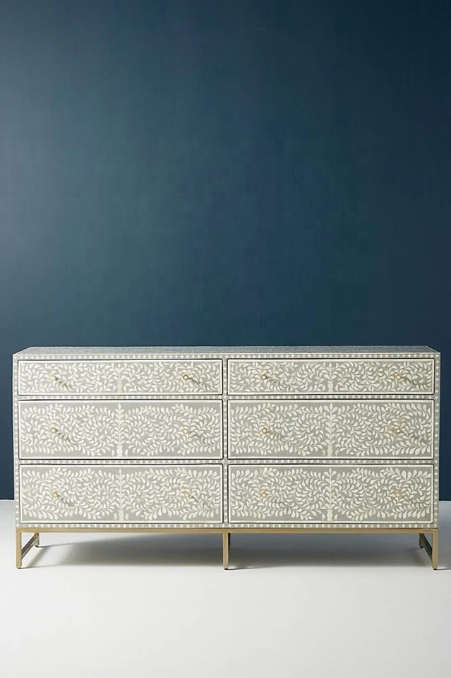 Cómoda de 6 cajones con incrustaciones de hueso hechas a mano con diseño de muebles de lujo, tocador con diseño de incrustaciones de hueso gris