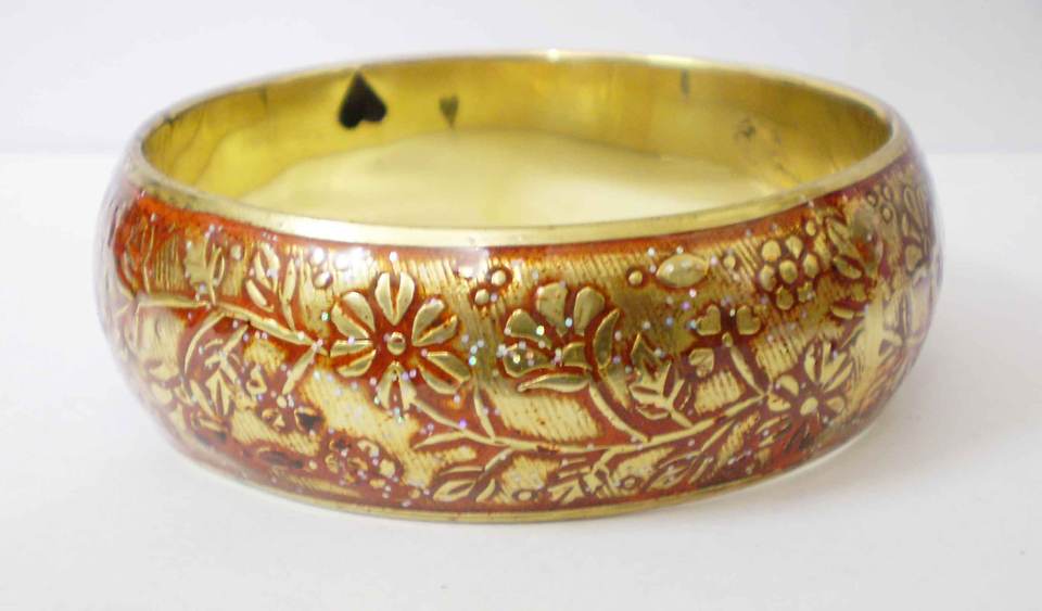 Brazalete de Cobre Chapado en Oro de Lujo con Incrustaciones de Esmalte Rojo Intrincado en Forma de Vid Floral y Brillantina, Artesanía Metálica Sofisticada