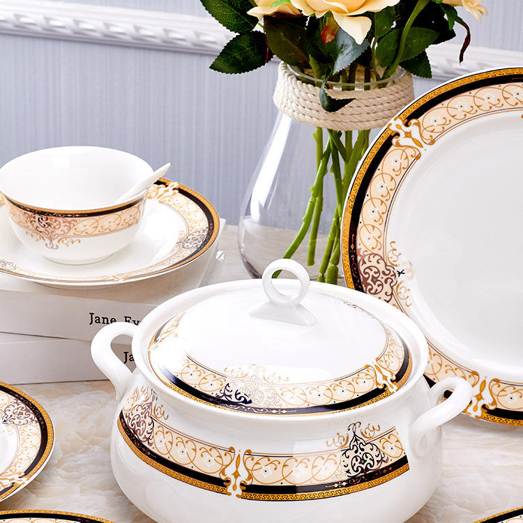 Juego de Vajilla de Porcelana Fina con Borde Dorado de Lujo, Vajilla de Cerámica de Alta Gama con Caja de Regalo para Cenas Elegantes en Casa y Regalos de Boda