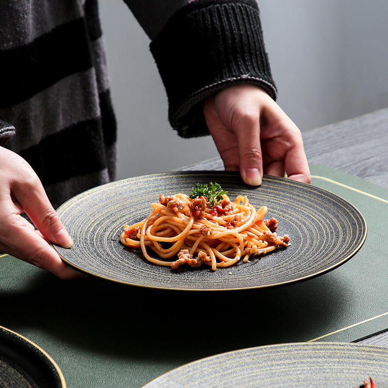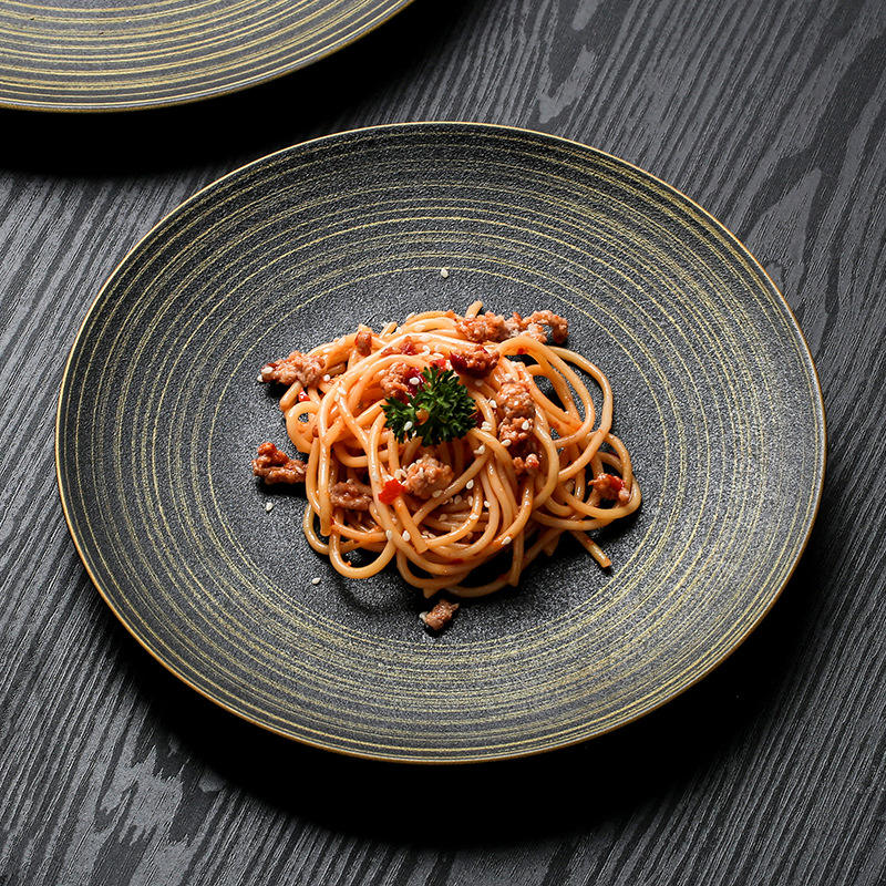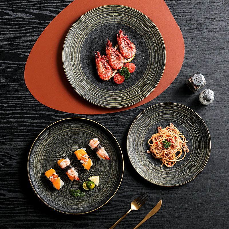 Vajilla de Lujo con Borde Dorado para Hoteles y Restaurantes, Platos de Cerámica de Gres Negro de Forma Irregular para Filetes, Postres y Tazones
