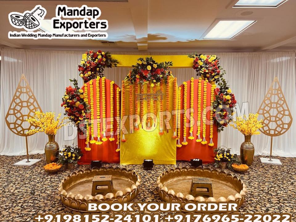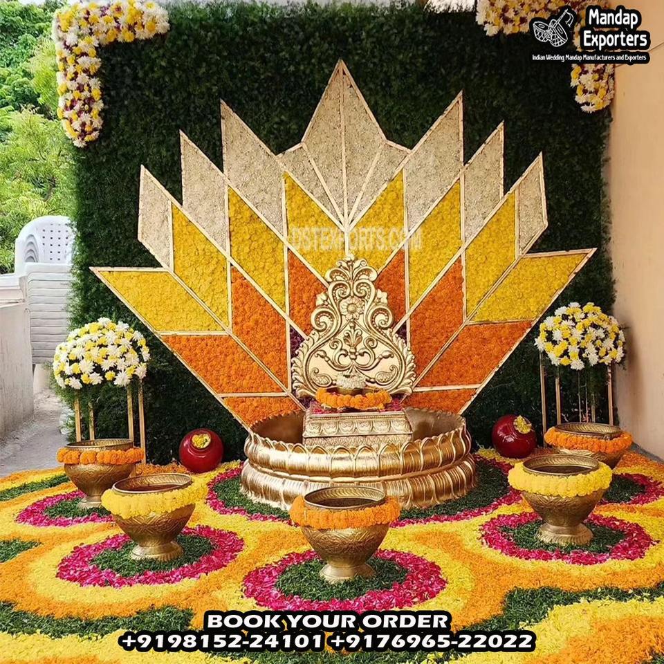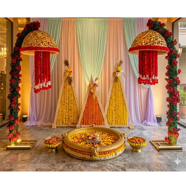 Juego de Urli de Lujo en Dorado con Fondo Triangular de Caléndulas, Paneles para la Gran Ceremonia Haldi, Decoración de Escenario para Eventos Haldi con Temática de Jardín