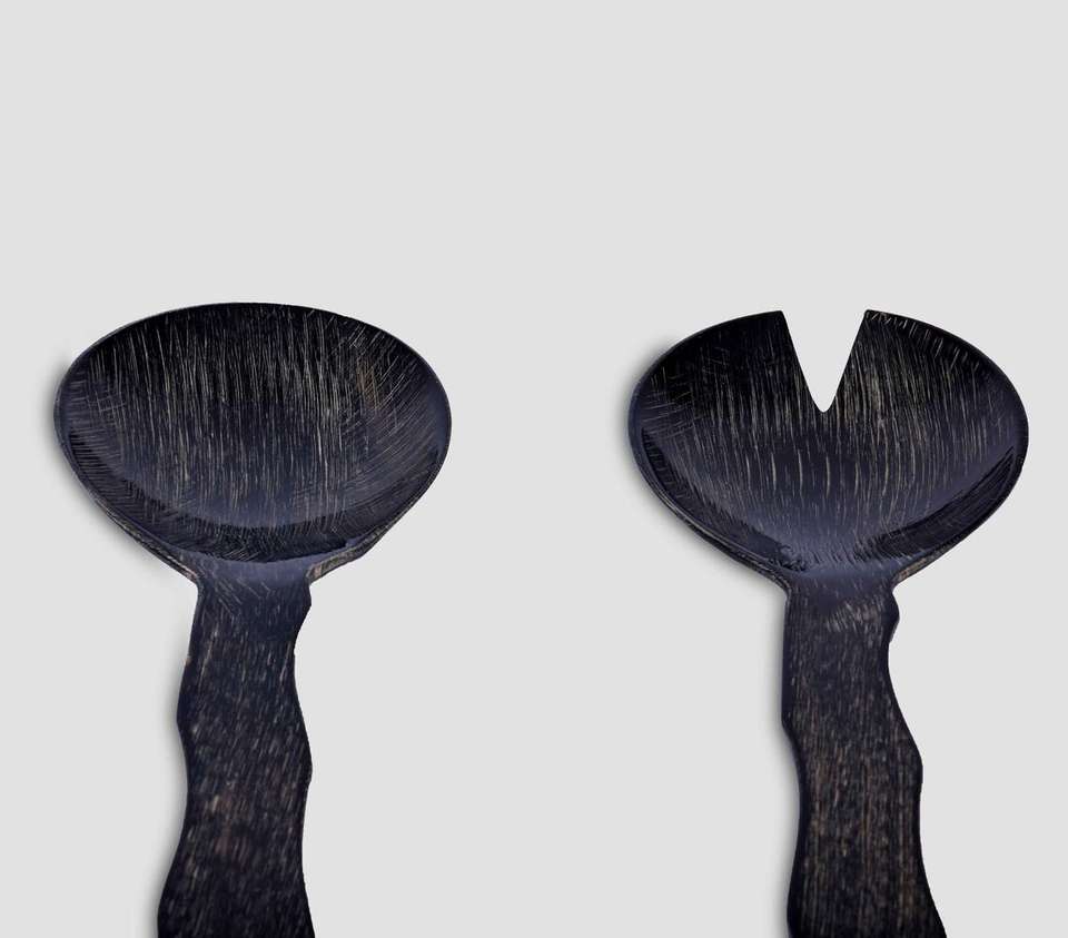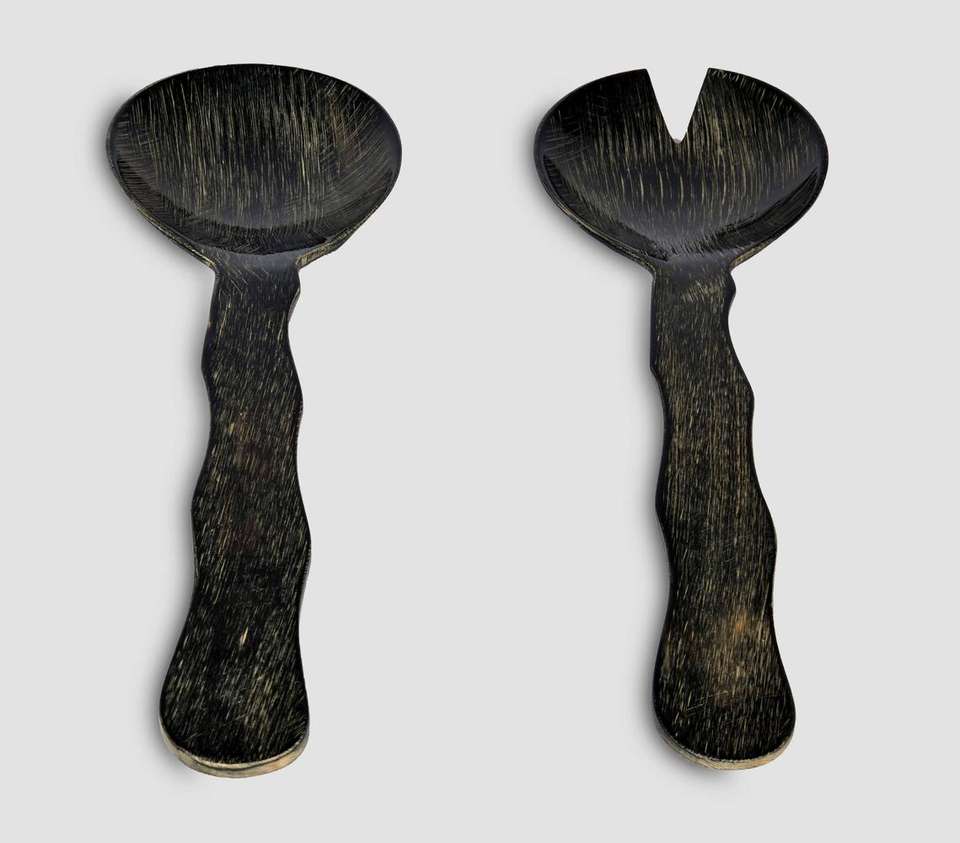 Juego de Cubiertos para Ensalada de Madera Marrón Oscuro Hechos a Mano de Lujo con Mangos Ergonómicos Ondulados Únicos, Cuchara para Mezclar Grande y Tenedor para Servir