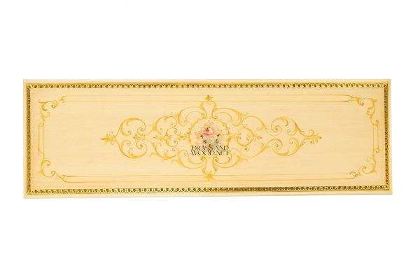 Mesa Consola de Lujo Hecha a Mano en Oro con Delantal Tallado Ornamentado y Estantes Dobles de Mimbre en Estilo Clásico