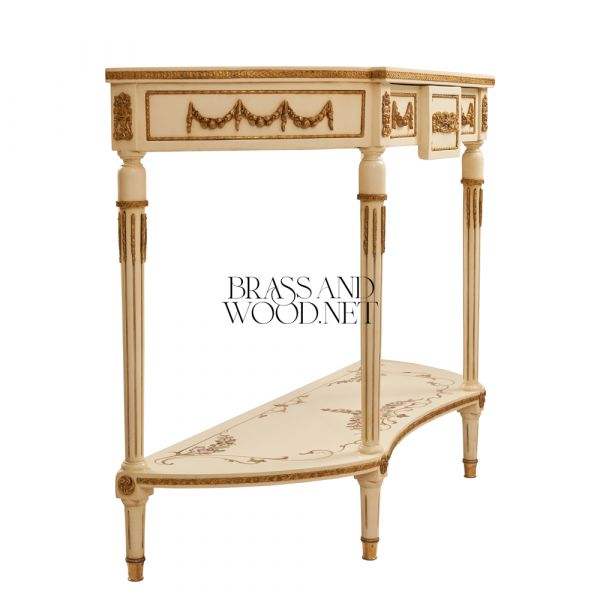 Mesa Consola de Lujo Hecha a Mano en Color Marfil y Dorado con Adornos de Latón y Detalles Florales Pintados en Estilo Europeo Clásico