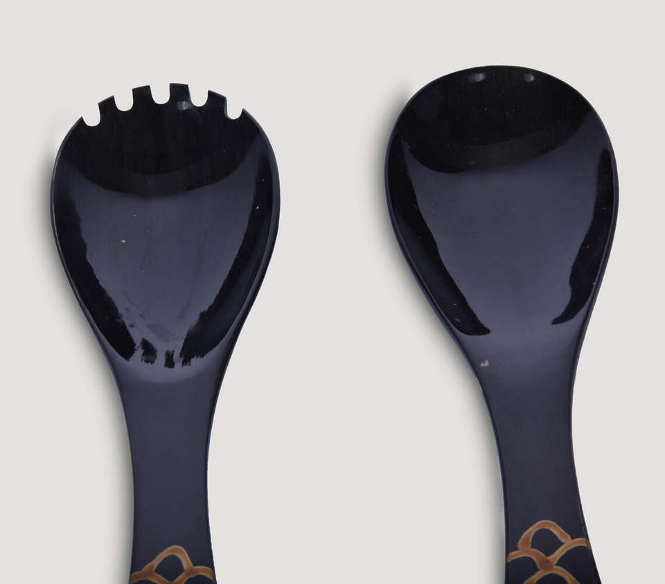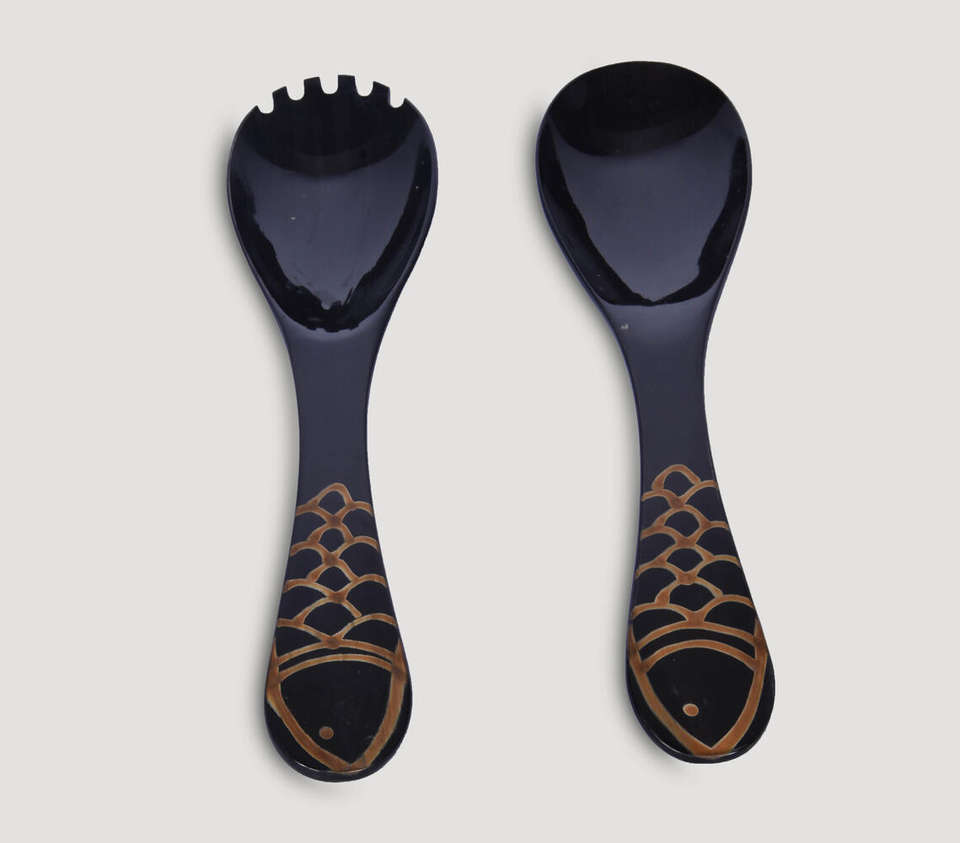Juego de Servidores de Ensalada de Cuerno Natural Negro Sólido, Hecho a Mano, con Asas Únicas con Grabado Artístico de Escamas de Pescado, para Mezclar