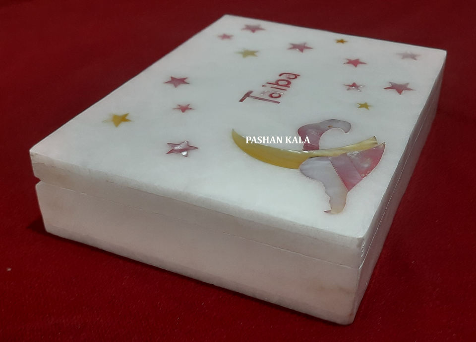 Caja de joyería de nácar con incrustaciones de mármol blanco puro hecha a mano de lujo, forma rectangular con acabado fino para regalo de decoración del hogar