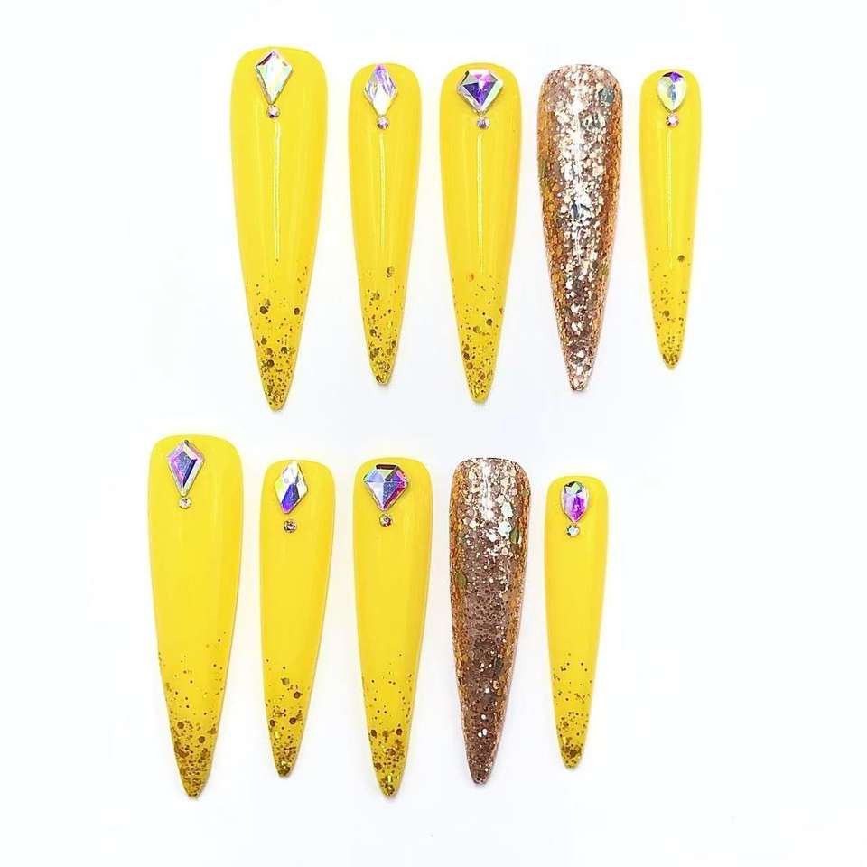 Juego de clavos de ataúd 3D largos de lujo Yellow Diamond Chic Aura Press-On con pegamento Características de mezcla de diseño personalizado