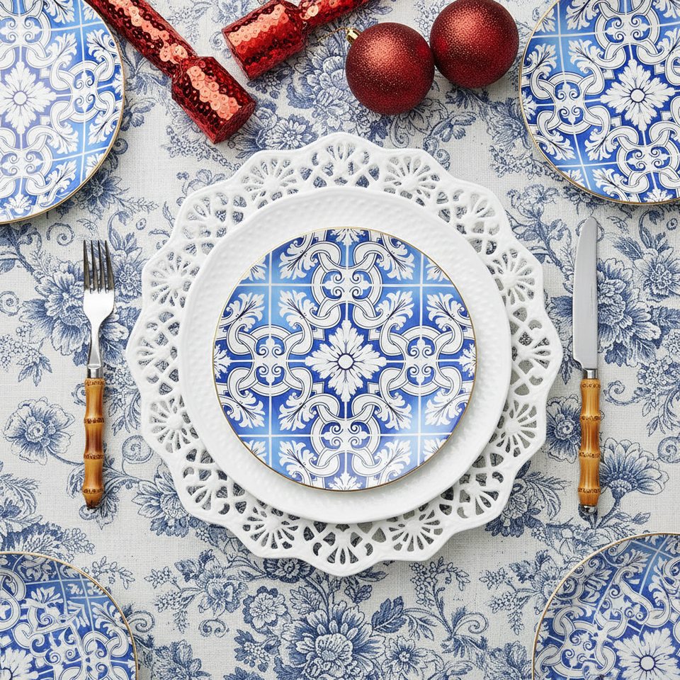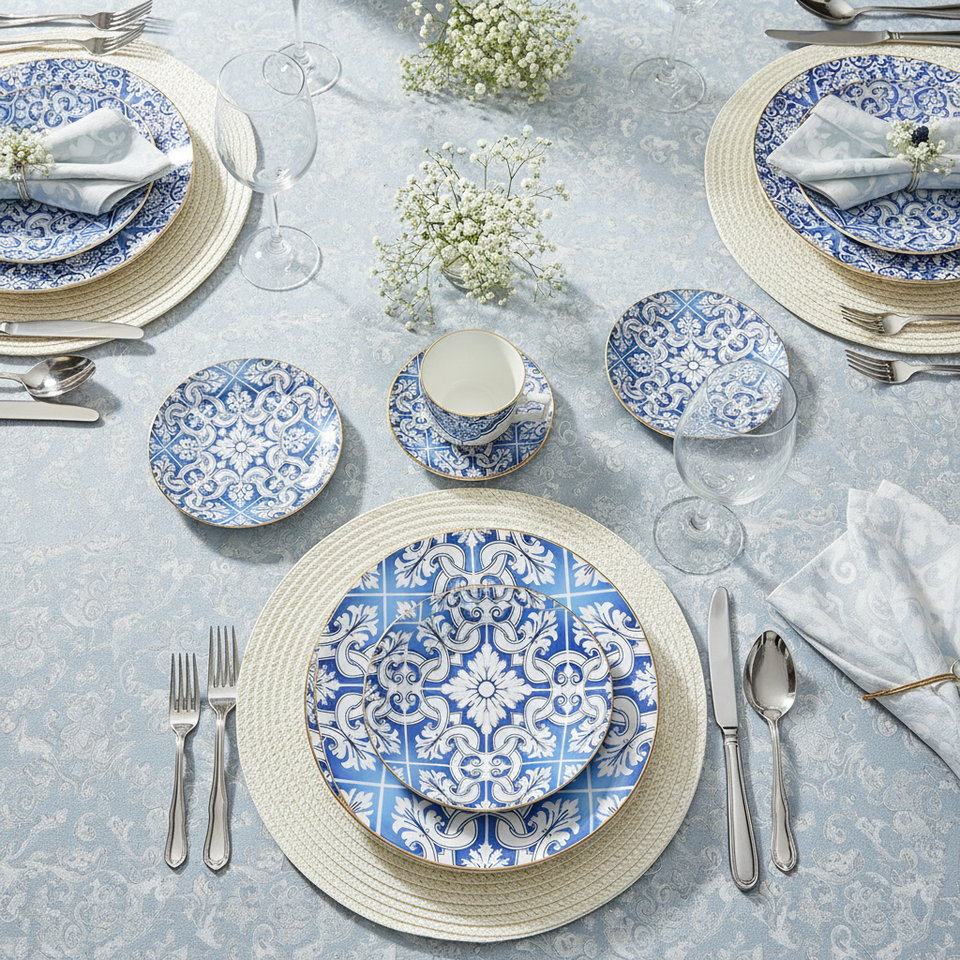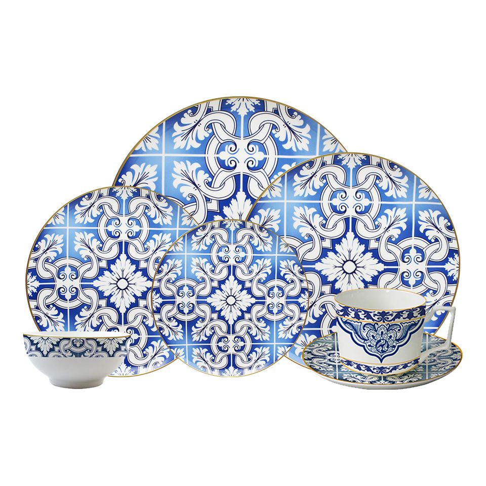 Vajilla de Porcelana Blanca y Azul Mediterránea de Lujo, Platos de Cerámica con Borde Dorado, Taza de Café, Vajilla de Porcelana Fina al por Mayor