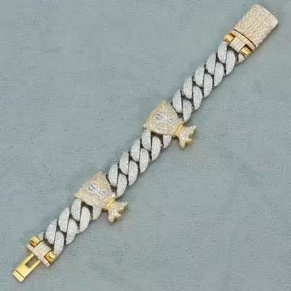 Pulsera de eslabones cubanos de plata 925 de lujo para hombre con diamantes de moissanita helados con acabado de oro amarillo para bodas o fiestas de compromiso