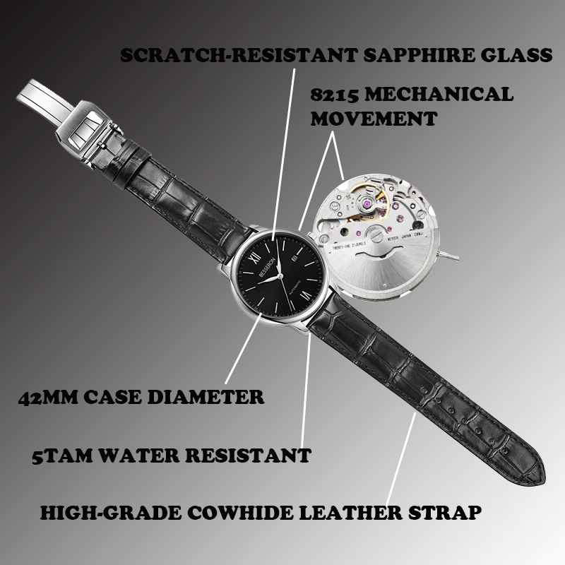 Reloj Mecánico Automático Deportivo de Lujo para Hombre, Manecillas Luminosas, Correa de Cuero y Acero Negro, Marca OEM, Esfera Personalizada con Diseño Hueco