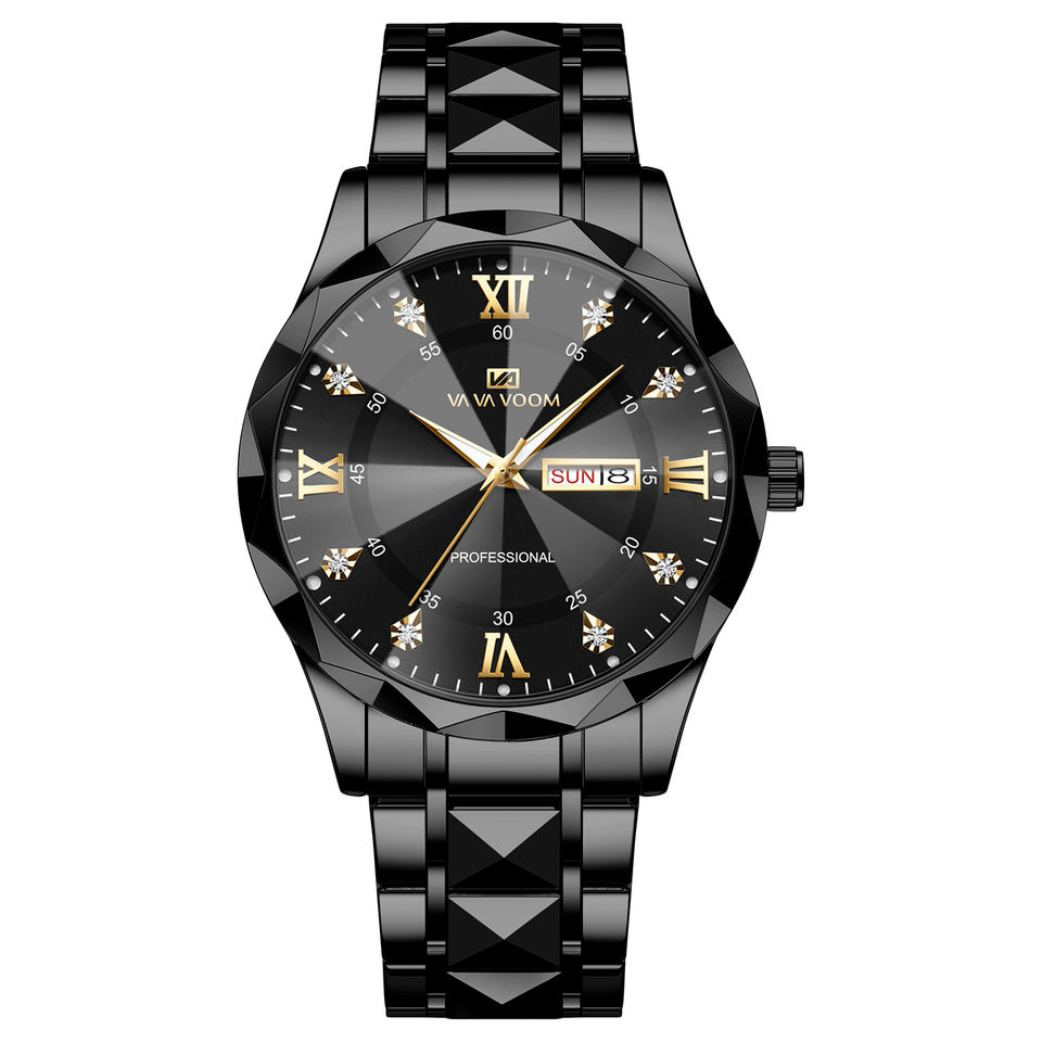 Reloj de pulsera de lujo para hombre, totalmente dorado, con esfera negra, detalles de diamantes y bisel facetado
