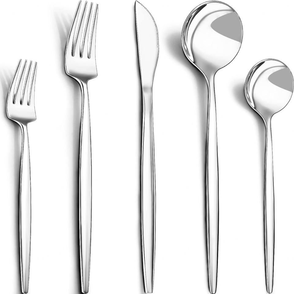 Juego de Cubiertos de Lujo Plateados con Acabado Espejo Metálico, Tenedor, Cuchillo, Cuchara, 5 Piezas, Kit de Cubiertos