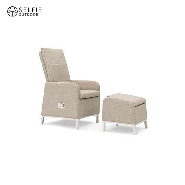 Muebles de Exterior de Lujo con Marco de Aluminio Moderno, Silla Reclinable de Tela para Patio y Conjunto de Comedor para Hotel o Villa