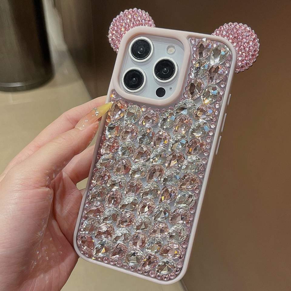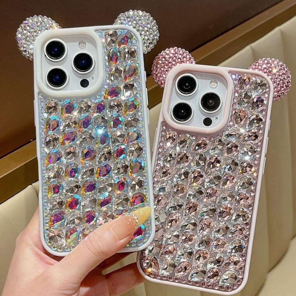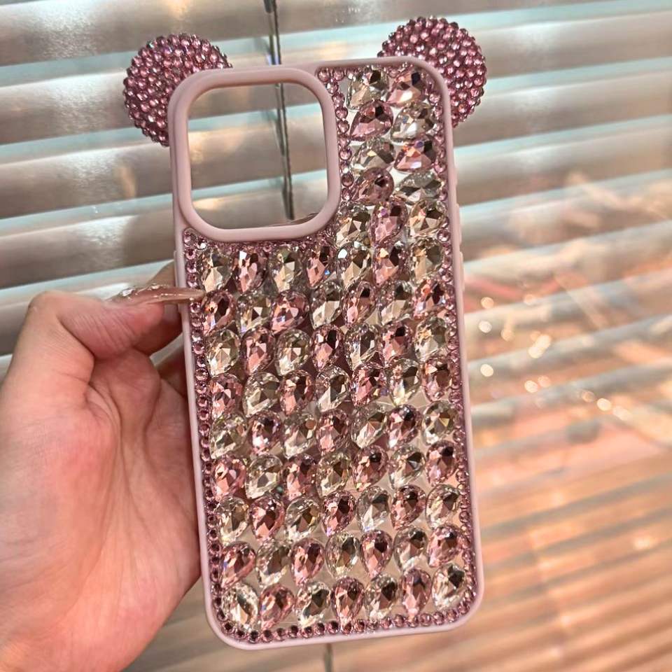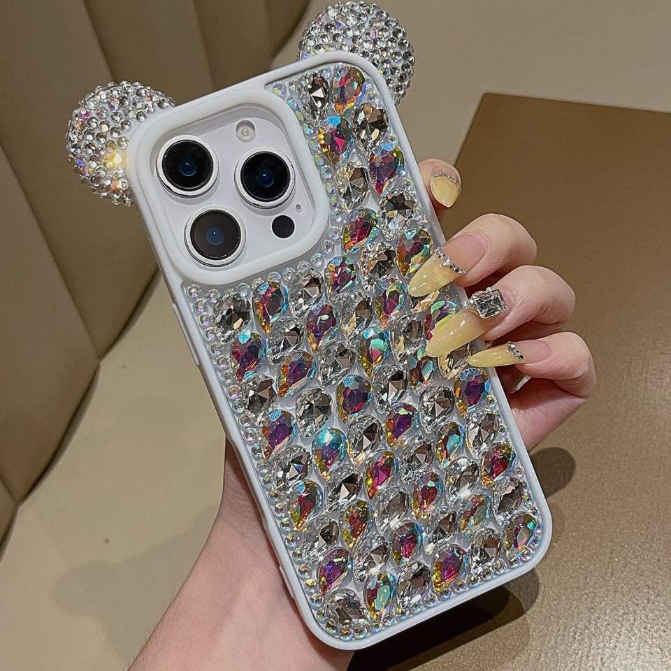 Funda de Lujo para Teléfono de TPU Antigolpes con Orejas de Ratón y Pedrería para 16/17 Pro Max 15/16/12/13/14 con Decoración de Purpurina
