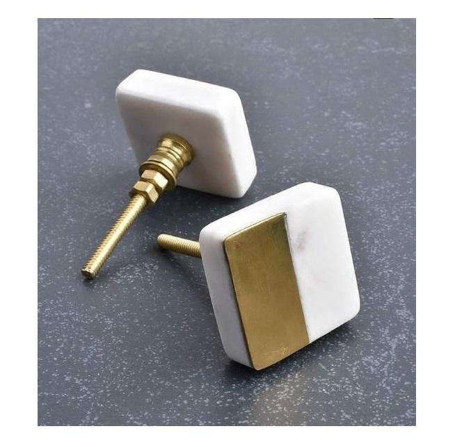Perilla de cajón náutico de lujo, mármol hexagonal blanco y gris con latón pulido y detalles dorados, recuerdo de alta calidad