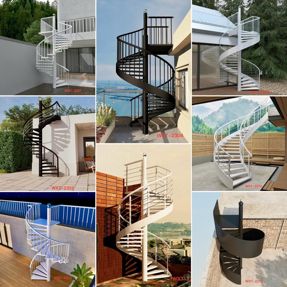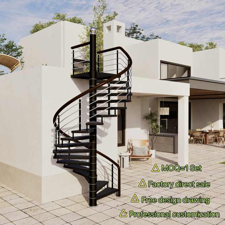 Barandilla de Acero Cepillado de Lujo para Exteriores, Escalones Sólidos a Cuadros para Patio de Villa de Alta Gama, Escalera en Espiral de Acero al Carbono