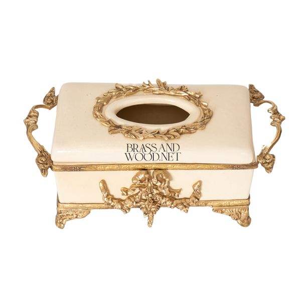 Caja de pañuelos de porcelana de lujo y latón envejecido con detalles dorados adornados y asas decorativas clásicas