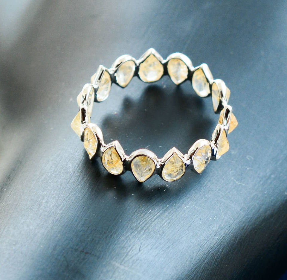 Anillo de eternidad de cuarzo rutilado dorado natural de lujo premium, engastado en plata de ley 925