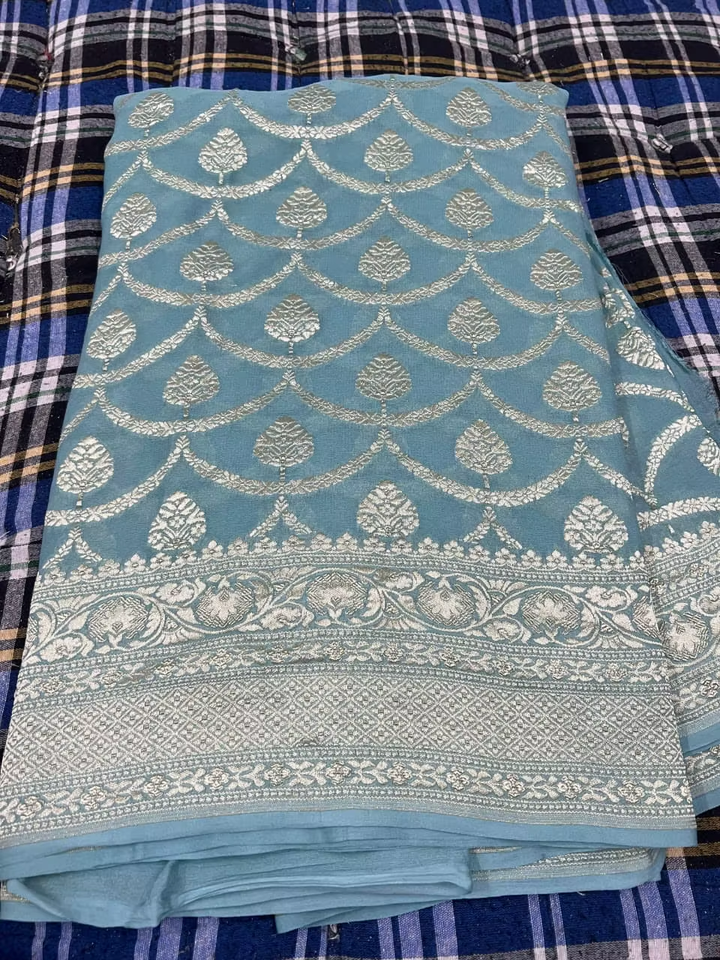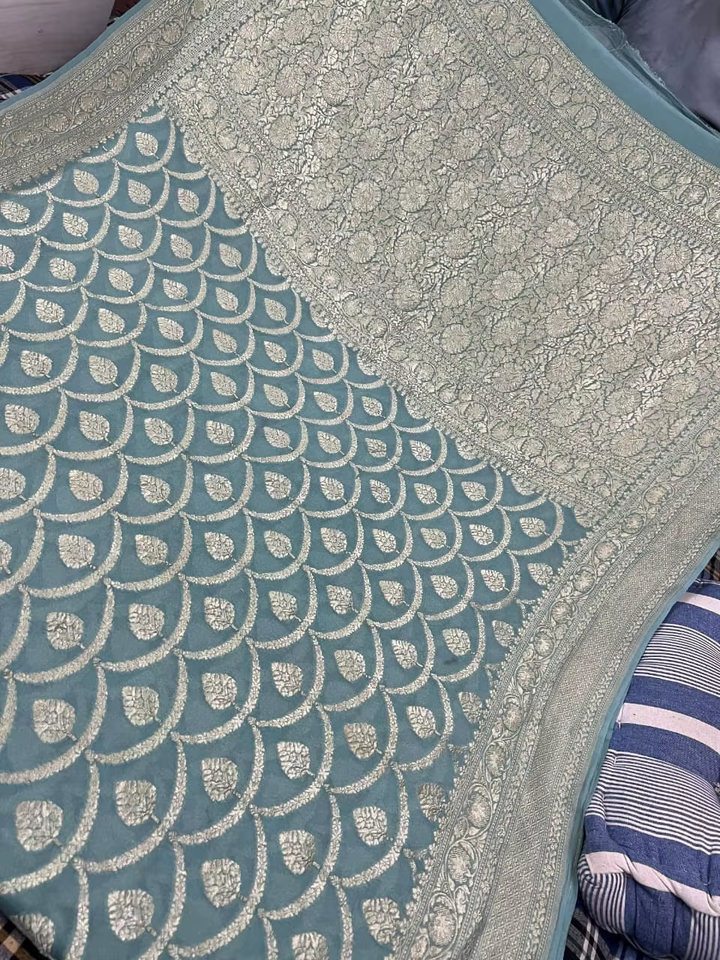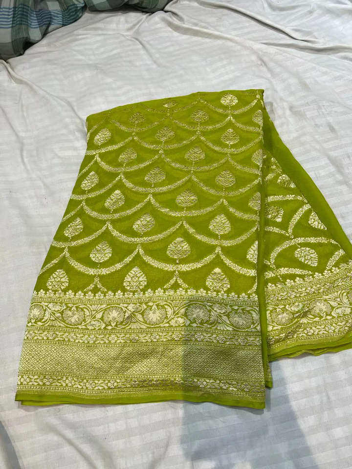 Sari de Georgette Khaddi Puro de Lujo, Tejido Semi-Artesanal, Suave y Fluido, Estética Étnica Rica, Detalles Hechos a Mano, para Fiestas y Eventos