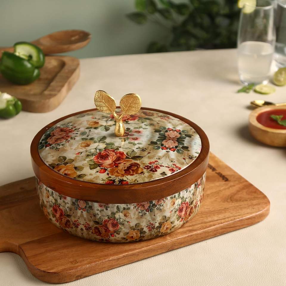 Caja de Madera de Mango de Lujo con Tapa con Estampado Floral, Ideal para Chapati y Vajilla India, Recipiente para Comida Caliente en Oferta