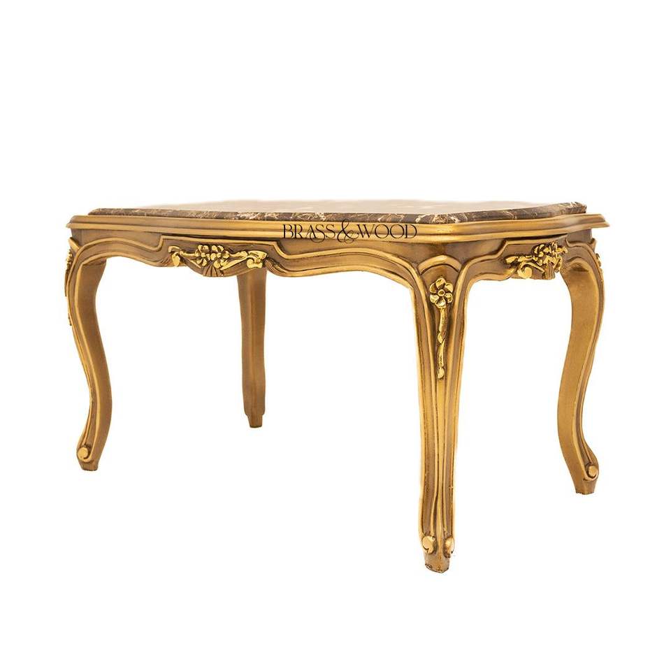 Mesa de Centro Rectangular de Lujo con Tapa de Mármol Marrón Oscuro y Marco de Madera Tallado a Mano en Oro Antiguo para Interiores Clásicos