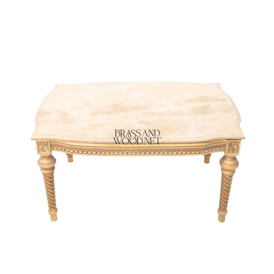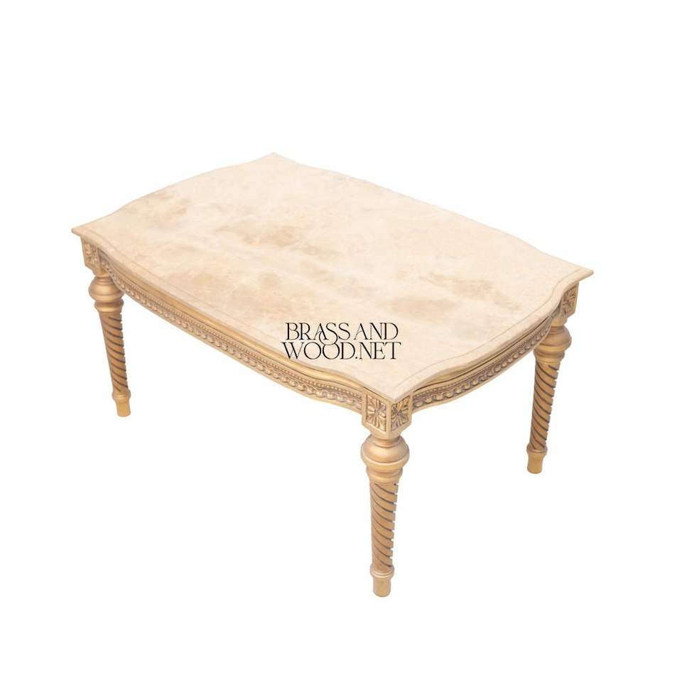 Mesa de Centro Rectangular de Lujo con Tapa de Mármol Beige Premium y Marco Tallado a Mano en Oro Antiguo para Sala de Estar Clásica
