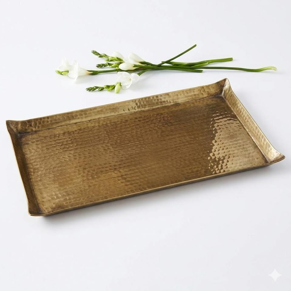 Bandeja de Servir Rectangular de Metal Dorado de Lujo con Asas de Anillo, Decorativa, Martillada a Mano, para Mesa de Centro, Otomana, o para Servir Comida