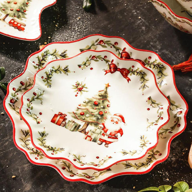 Platos de porcelana decorativos con borde rojo de lujo y calcomanía de Papá Noel, forma de estrella, platos para servir navideños