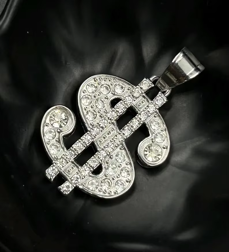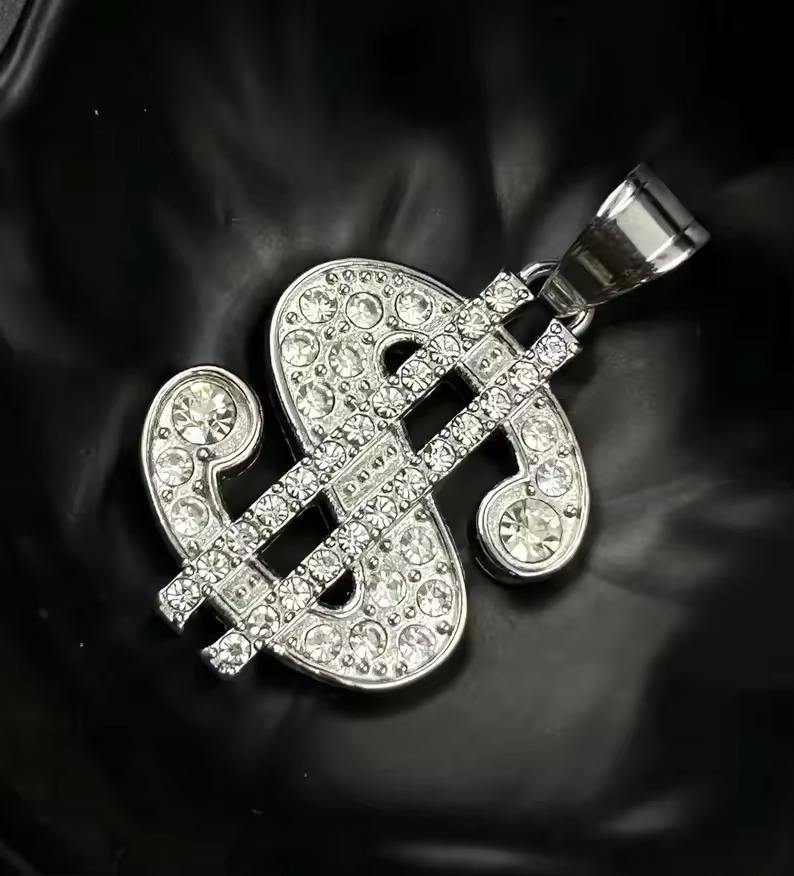 Colgante de Lujo con Baño de Rodio, Diseño de Símbolo de Dólar, Estilo Hip Hop, Tono Plateado, para Hombres y Mujeres