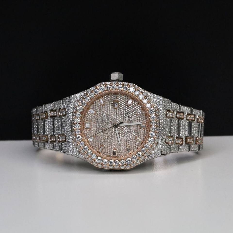 Reloj de Lujo Miyota con Movimiento de Cuarzo, Moissanita Dorada Rosa, Correa de Acero Inoxidable Completamente Engastada, Estilo Analógico, Encanto de Moda, Unisex