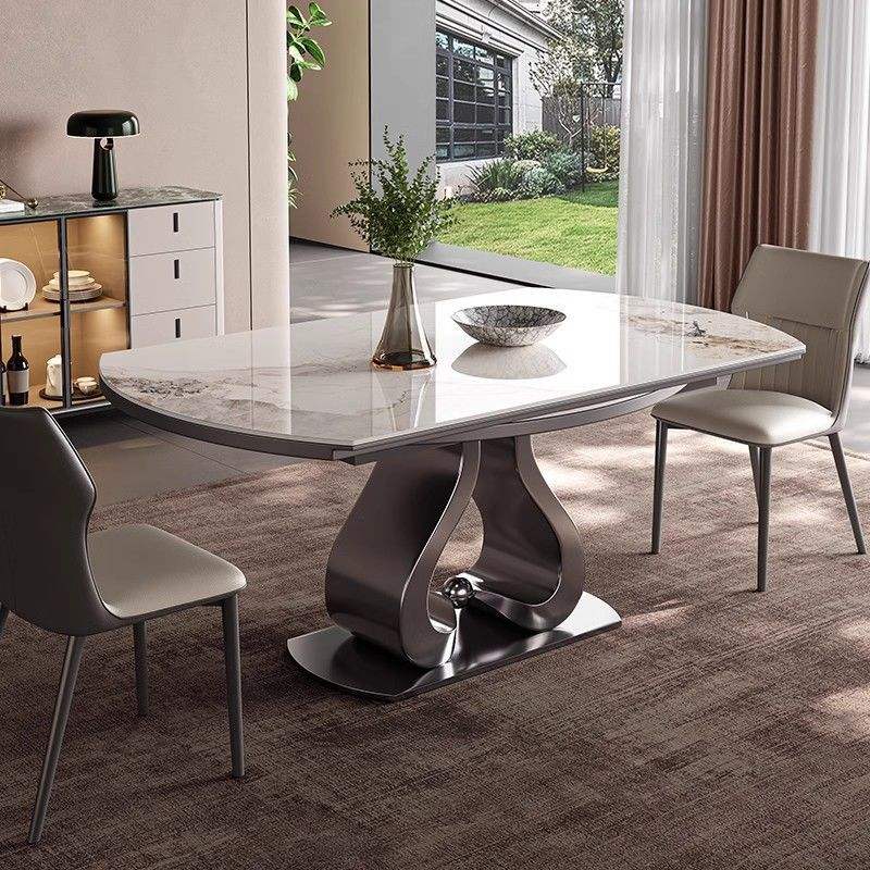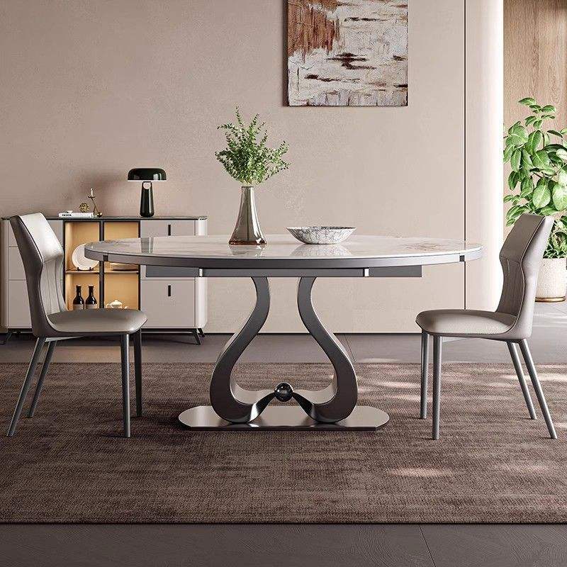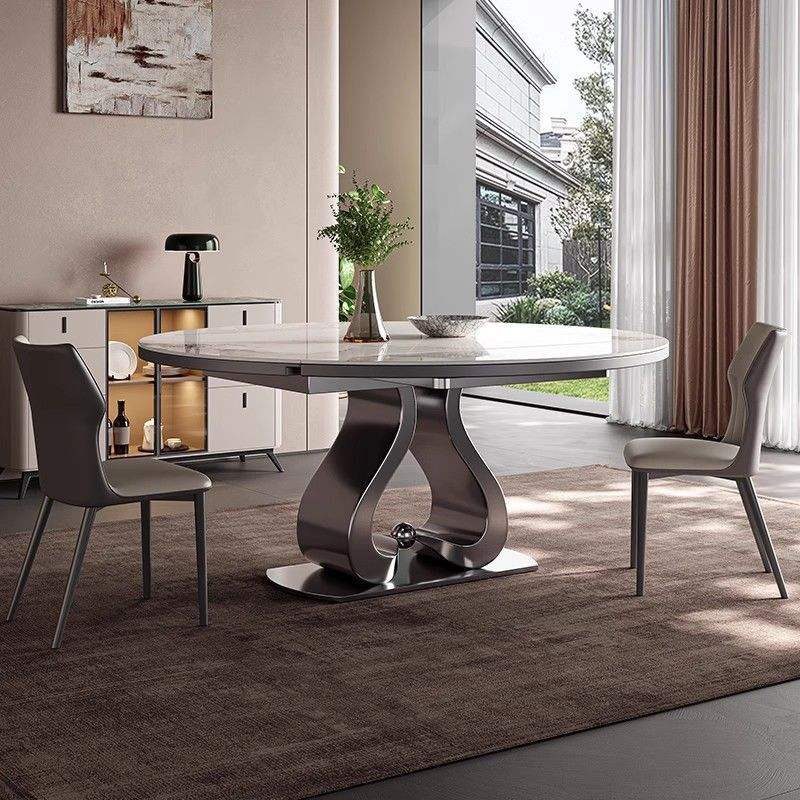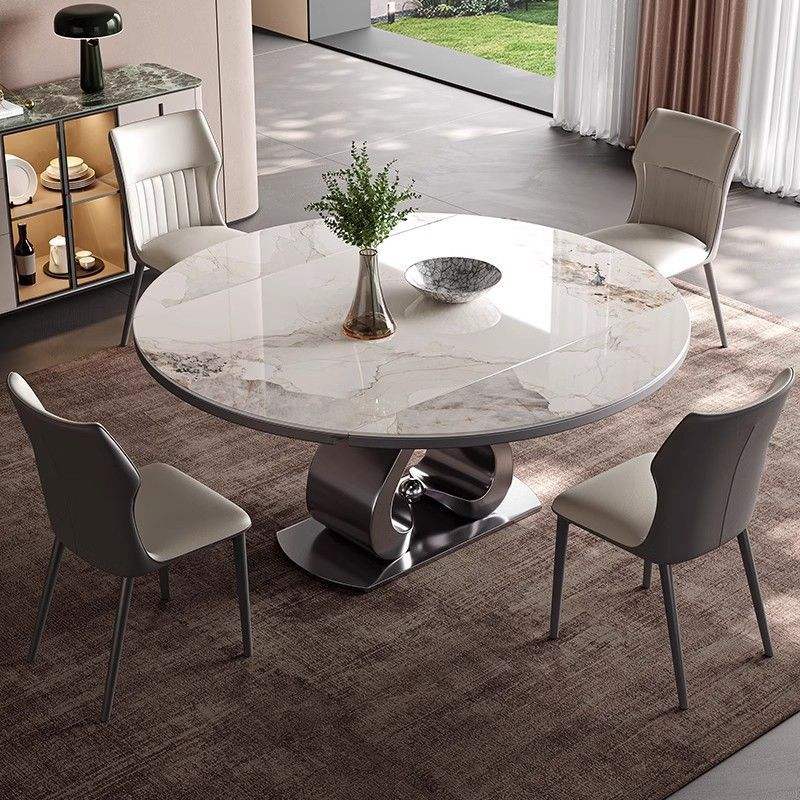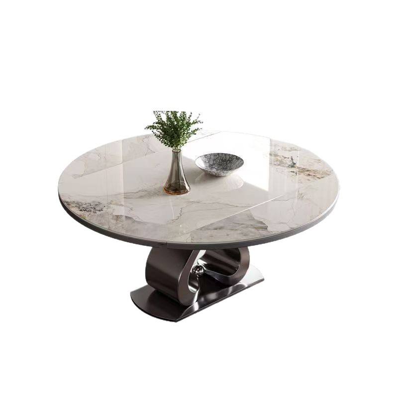 Mesa de comedor redonda de lujo con superficie de mármol y base de acero inoxidable convertible para comedor