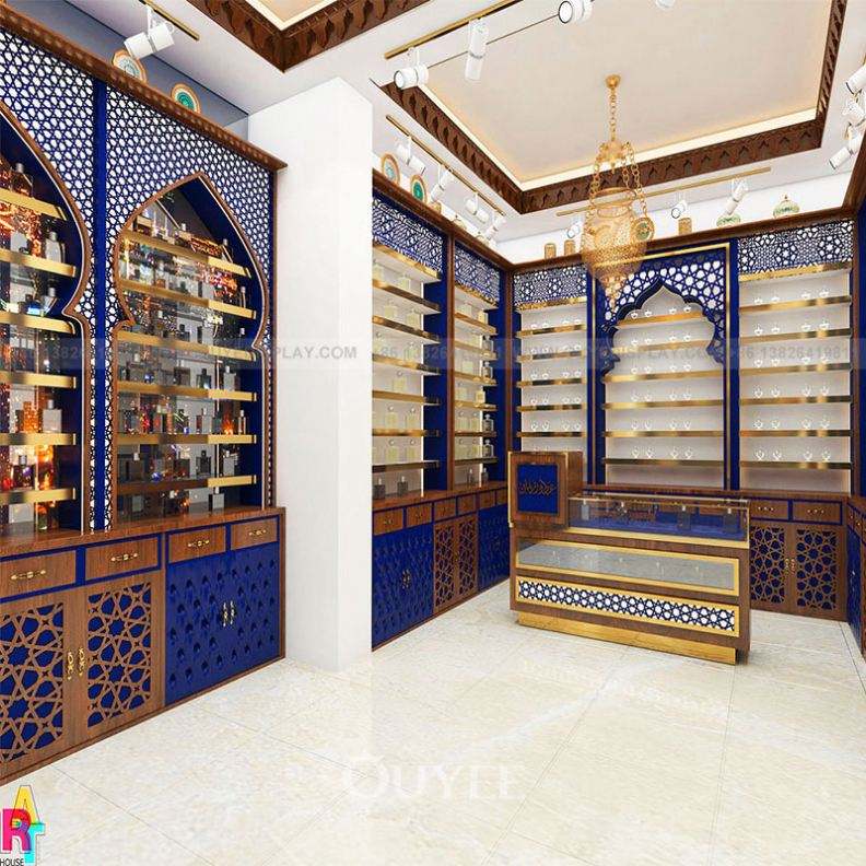 Tienda de perfumes de estilo real de lujo Diseño de interiores Estilo árabe Soporte de perfume de madera Estante de exhibición Escaparate de exhibición de perfume de vidrio