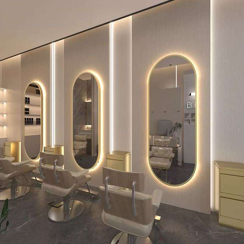 Set de estación de salón de lujo con espejo LED arqueado retroiluminado y puestos de peinado para salones de peluquería