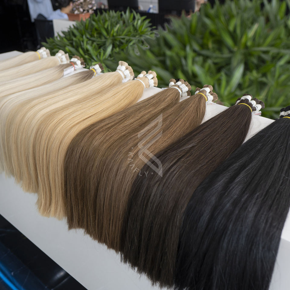 Extensiones de cabello europeo marrón liso medio de calidad de salón de lujo, cabello humano virgen crudo de un solo donante, estilo Fumi teñido a granel suave
