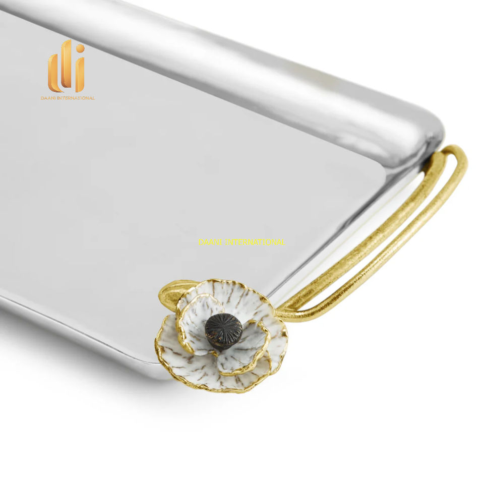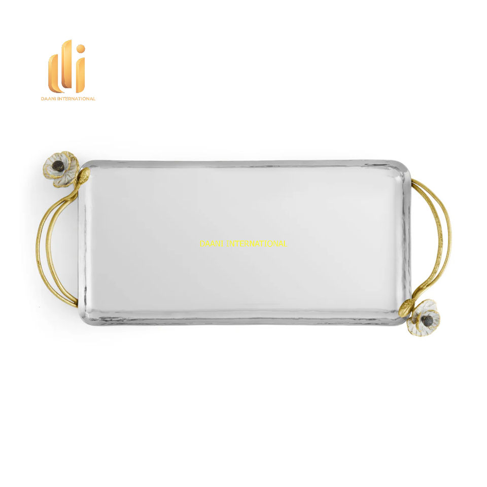 Bandeja de servicio de acero inoxidable de lujo con asas florales doradas Plato de bebida de comida rectangular hecho a mano para uso en la cocina del hogar
