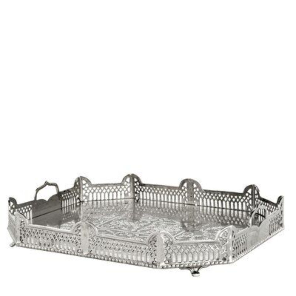 Bandeja de Servir Rectangular Estilo Marroquí de Lujo, Acabado en Níquel, Bandeja Decorativa de Metal con Asas y Patas, Adorno Decorativo para el Hogar
