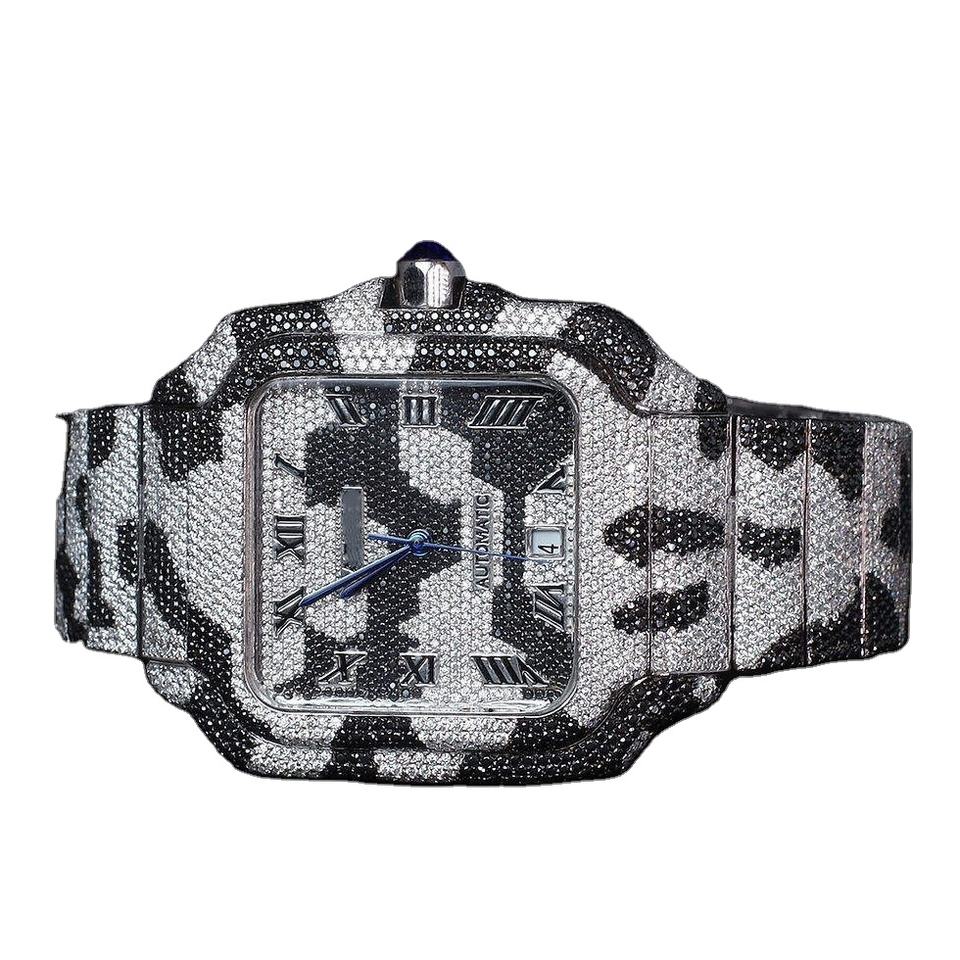 Reloj de lujo de dos tonos con diamantes de moissanita completa, reloj personalizado de oro rosa y plata, patrón de camuflaje, banda de acero inoxidable de alta calidad