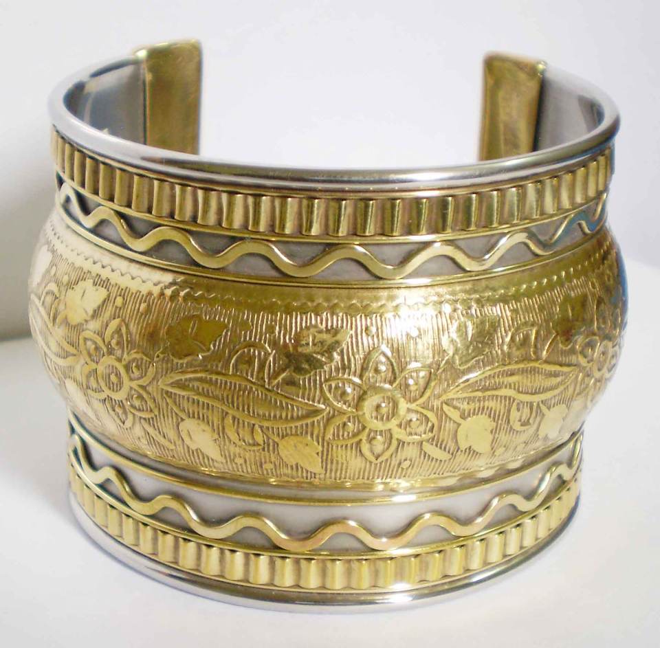 Brazalete de Cobre Chapado en Oro de Dos Tonos de Lujo para Mujer, Diseño Floral Tradicional Grabado, Brazalete de Metal Sólido Elegante