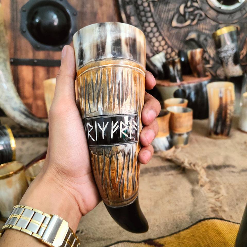 Cuerno vikingo de lujo con acabado pulido ecológico y bordes de latón para festivales, regalos, eventos y decoración del hogar en la costa más baja