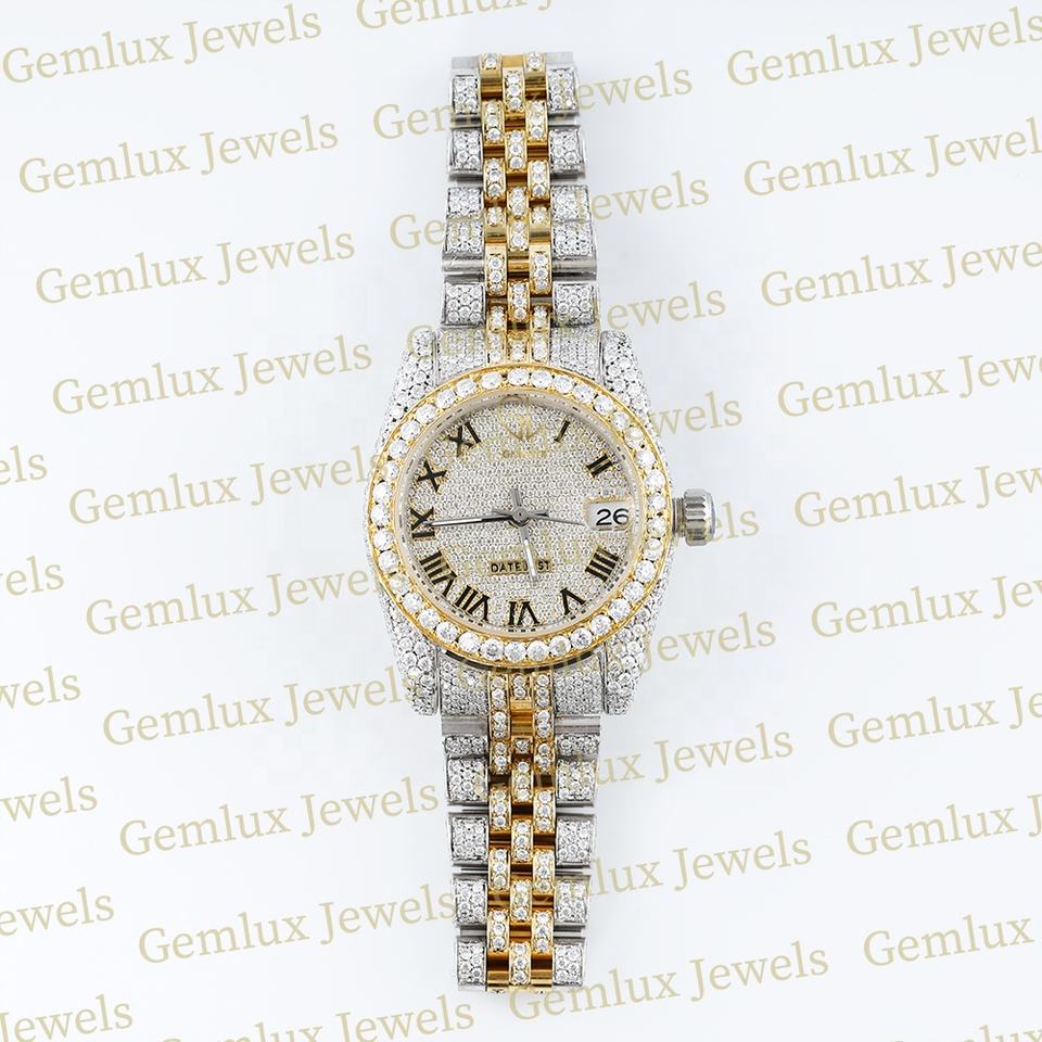 Luxury Wear Pass Diamond Tester Romen Dial D VVS Iced Out Moissanite Diamond Auto Date Reloj Hip Hop de dos tonos para hombres
