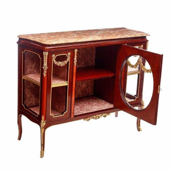 Aparador de Madera de Lujo con Tapa de Mármol, Vitrina Central Circular, Detalles de Latón, Estilo Antiguo Francés