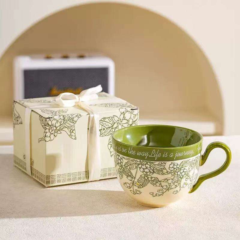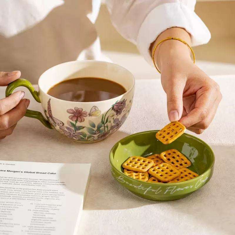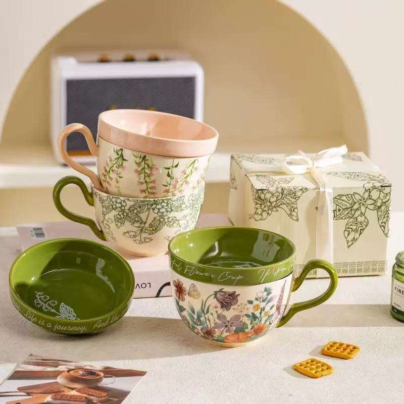 Taza de Desayuno de Cerámica de Gran Capacidad con Manivela, Estilo Rústico Retro, Taza de Café con Plato y Tapa, Juego de Tazas para el Hogar, Taza de Leche, Regalo Original