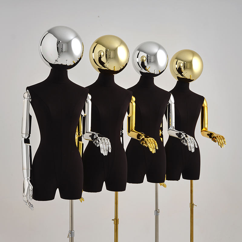 Maniquí de medio cuerpo para mujer, vestido de exhibición, forma de costura, parte superior del cuerpo, cabeza cromada, brazos articulados, busto de mujer, M003-CFG