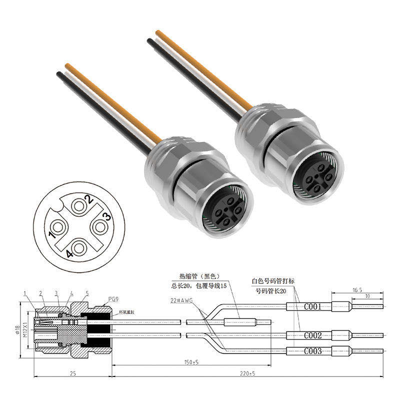 Product name:M12 4 pin a Code rear fastened female socket with wire