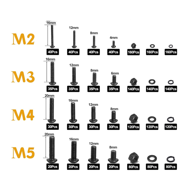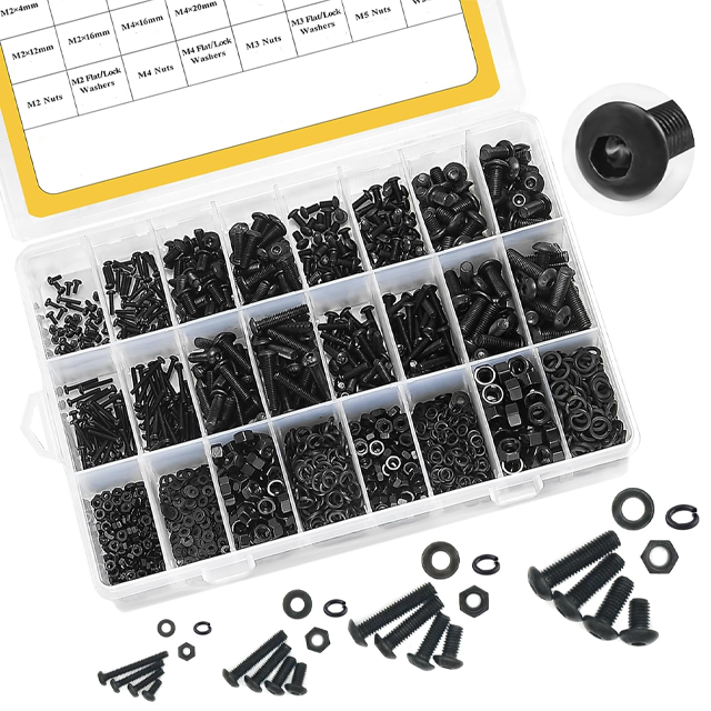 Kit de Tornillos, Tuercas y Pernos M2 M3 M4 M5 de Máquina con Arandelas Planas y de Seguridad Grado 10.9 de Acero Aleado con Cabeza de Botón y Hexágono Interior en Negro