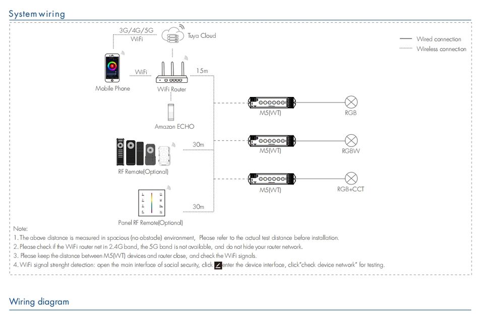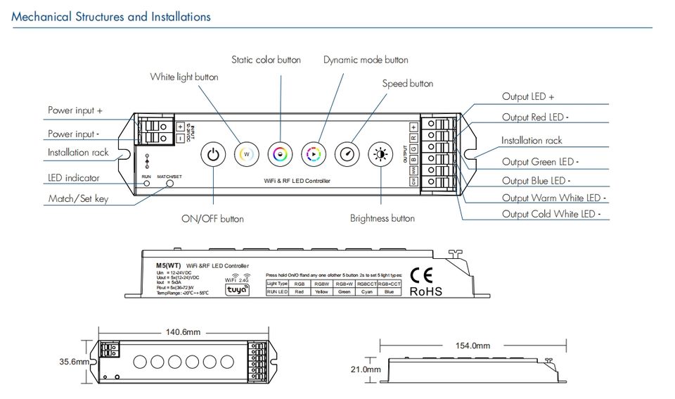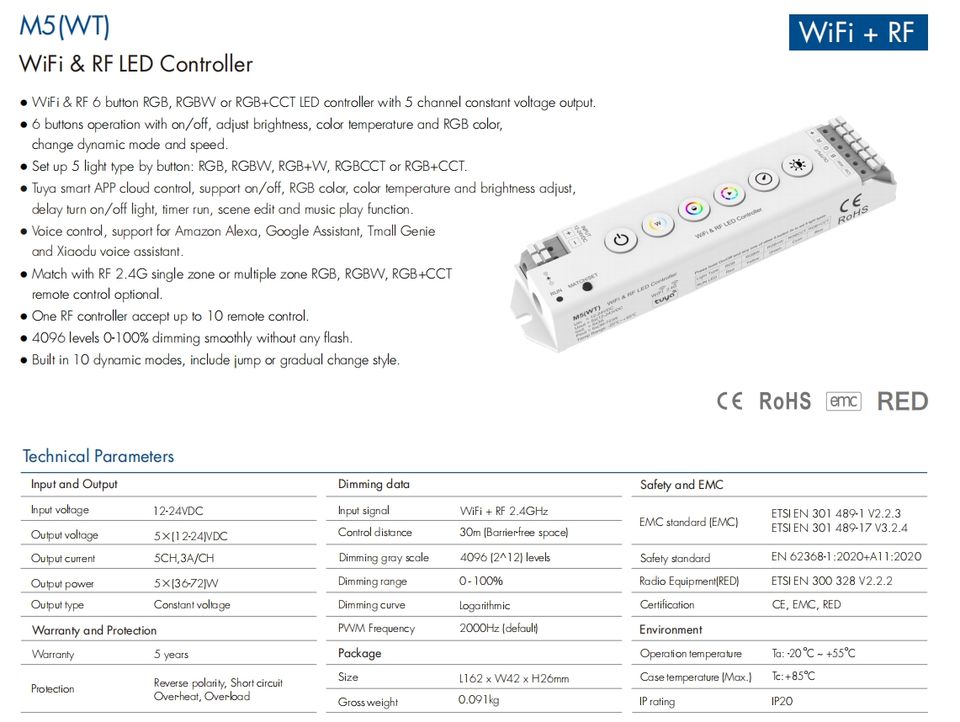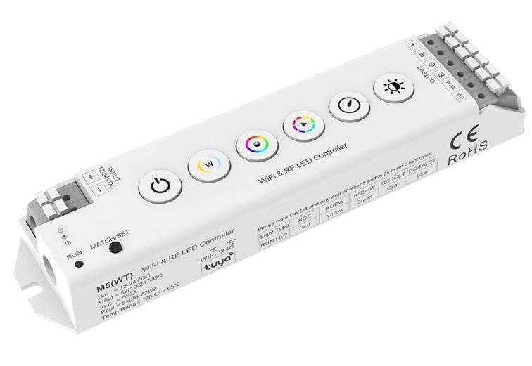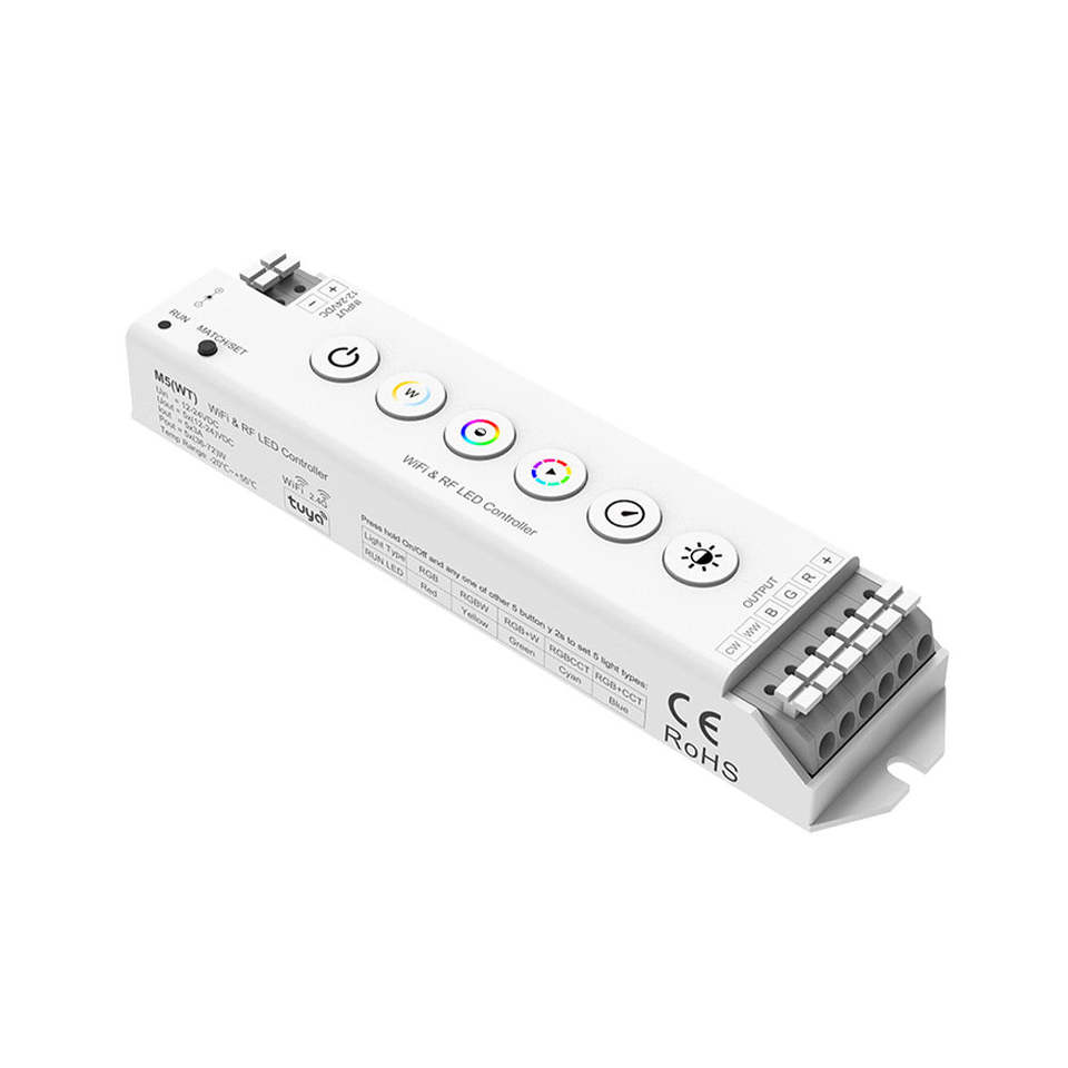 Controlador LED M5 12-24V 5CH WiFi y RF con 6 botones RGBWW RGBCW RGB LED Dimmer TUYA APP Control remoto Función inalámbrica