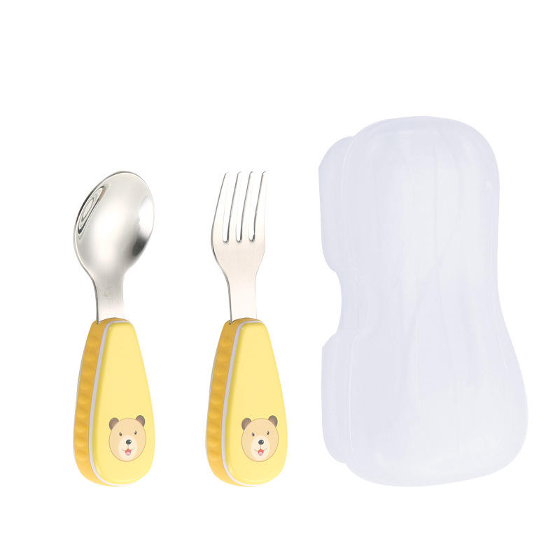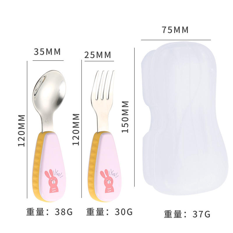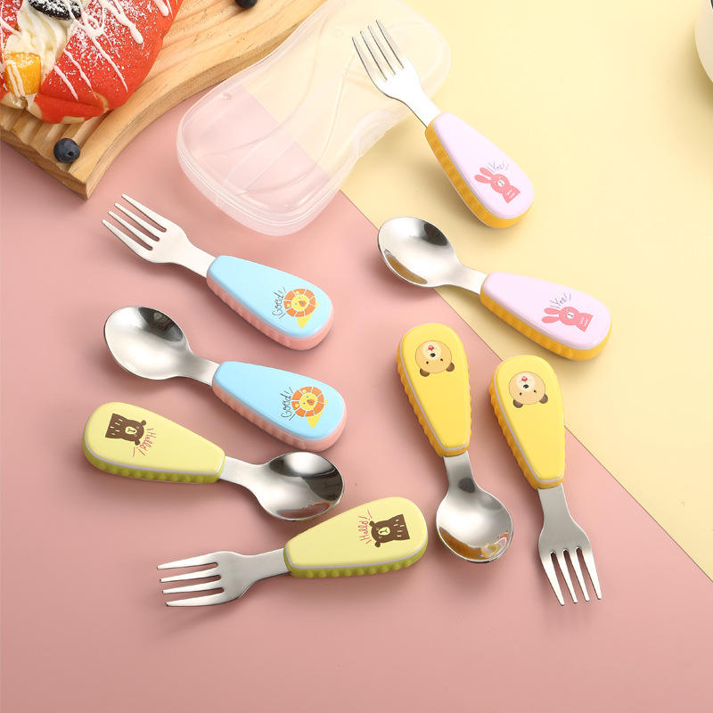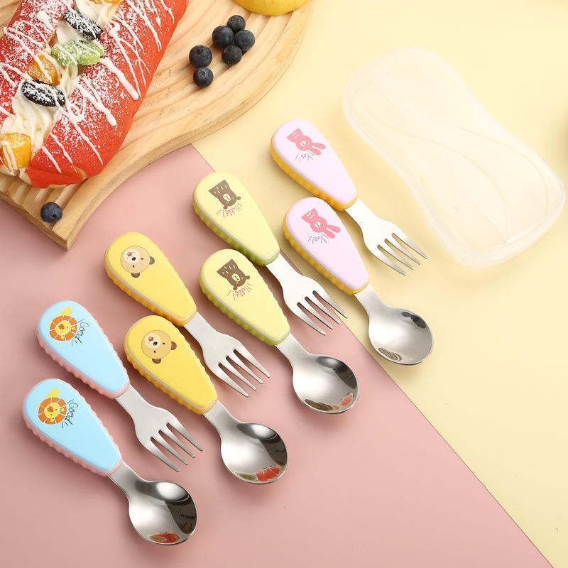 Cuchara y tenedor para bebé de acero inoxidable 304 de alta calidad MAIMAI con mano de plástico Cubiertos con mango de patrón de animales para niños con estuche