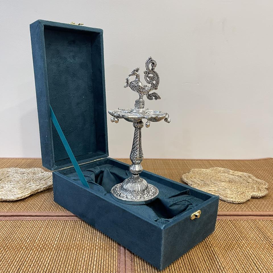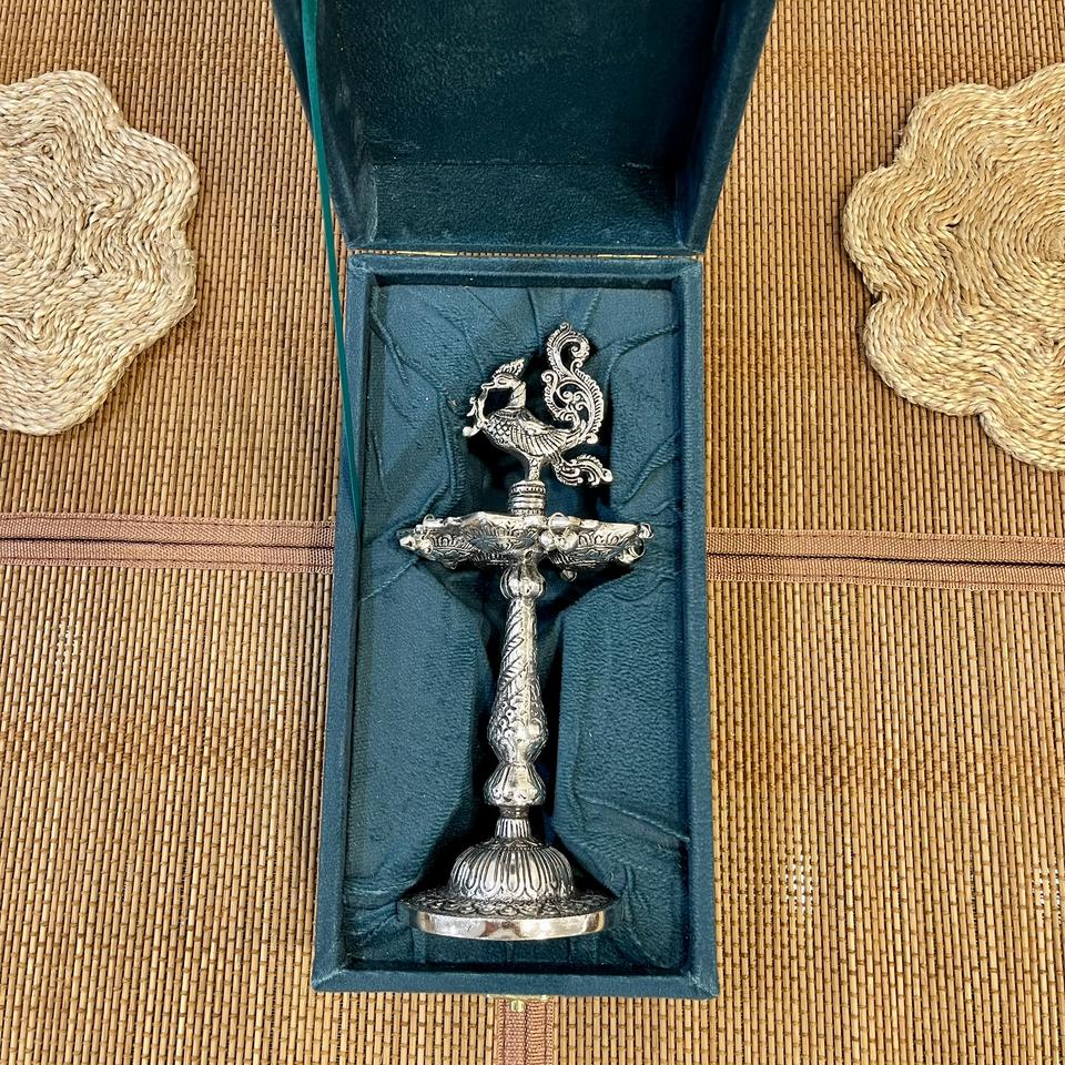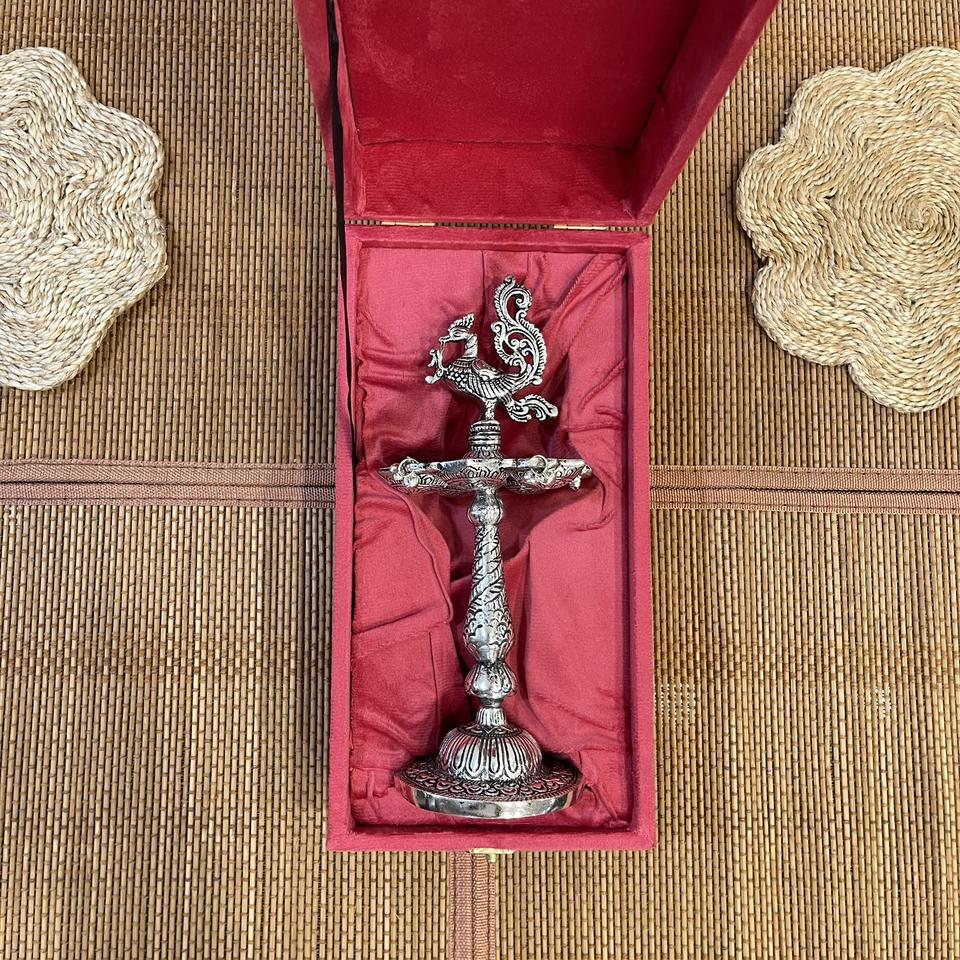 ARTESANÍA METÁLICA: PAJURO DE PLATA BAÑADA EN PLATA SAMAI / DIYA CON CAJA DE TERCIOPELO